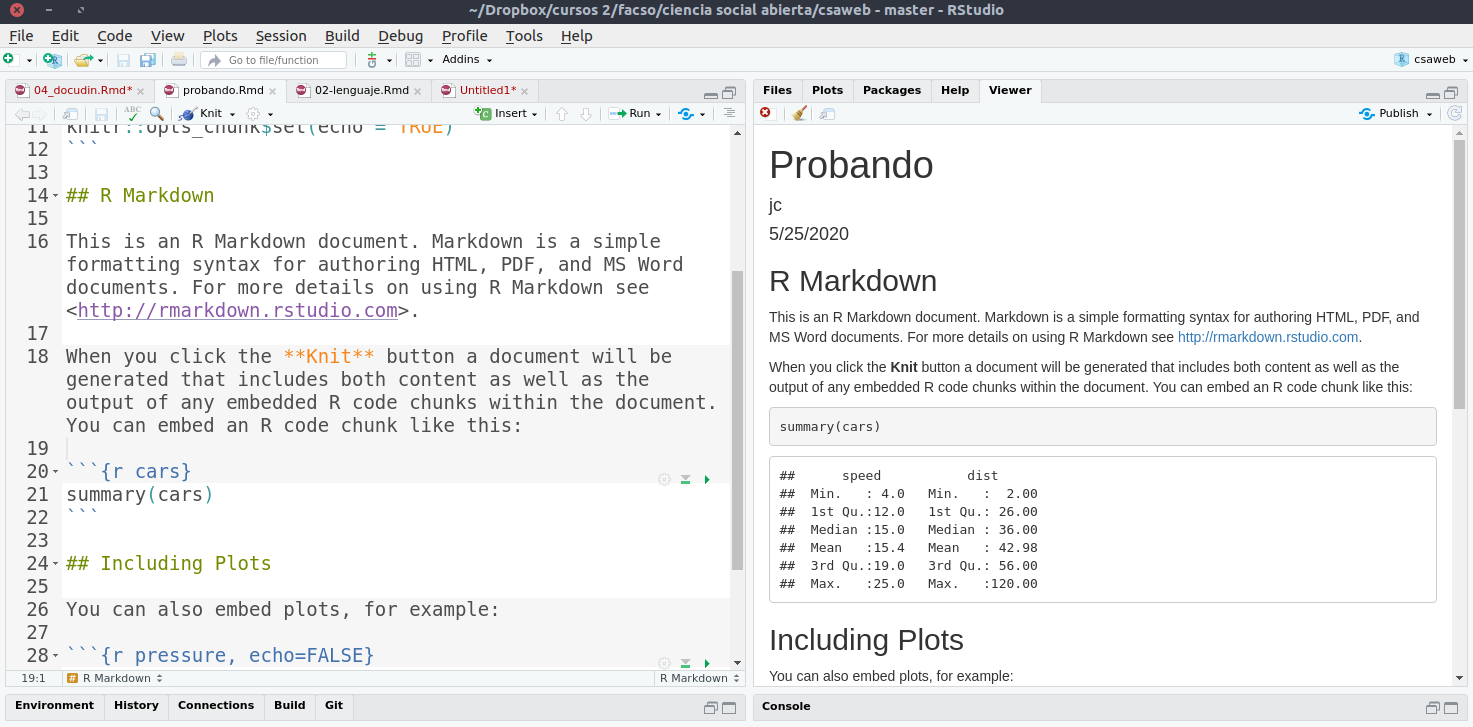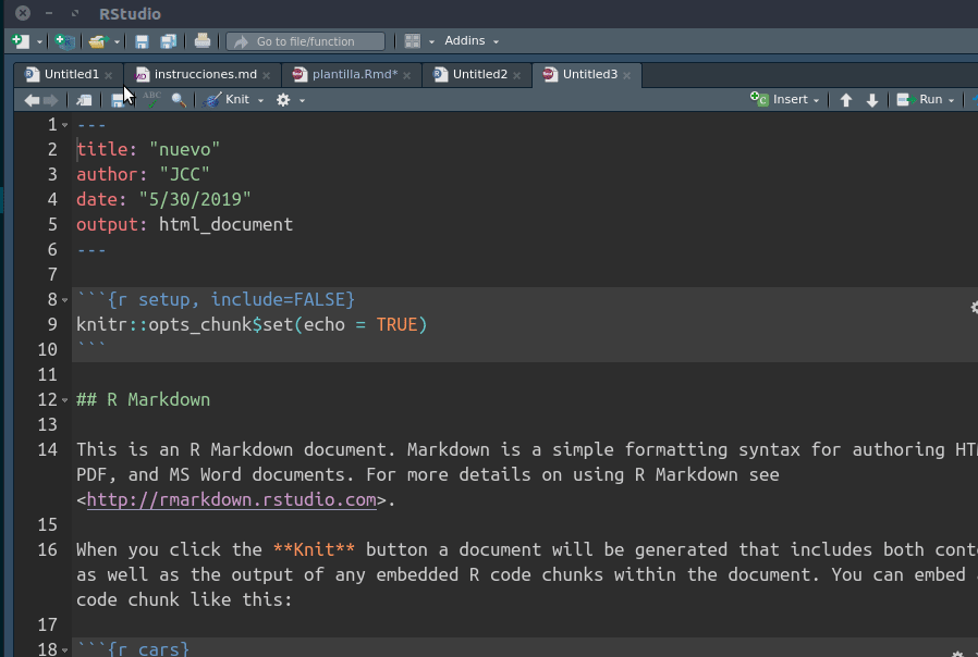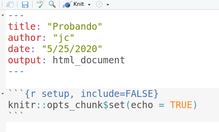 Para generar el documento, en la salida que especifiquemos, presionamos el botón de Knitr. El Knitear permite compilar el documento tejiendo o uniendo el contenido de manera secuencial. Combinará el texto plano y el código de R (en chunks) a partir de las instrucciones que le dimos en el YAML.
