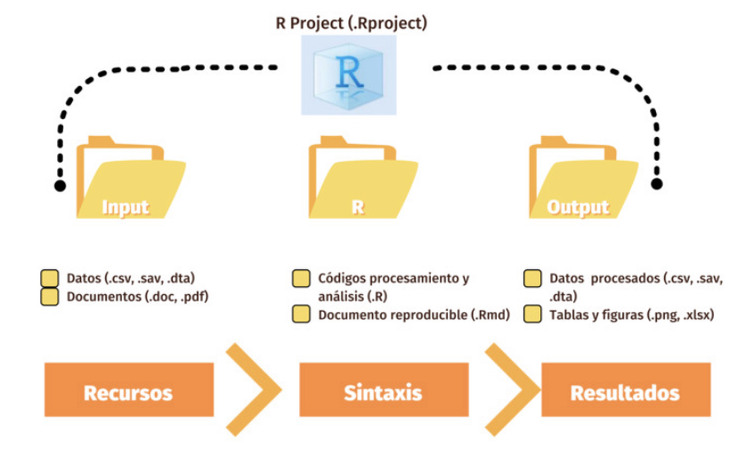 - En este curso trabajaremos con un flujo de trabajo reproducible, basado en el sistema IPO. IPO es un protocolo de estructura digital de carpetas que permite organizar, procesar y documentar los datos de un proyecto de investigación para que cualquier persona pueda ejecutarlo y compartirlo.